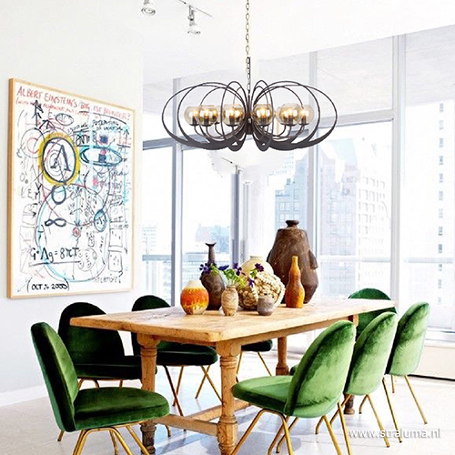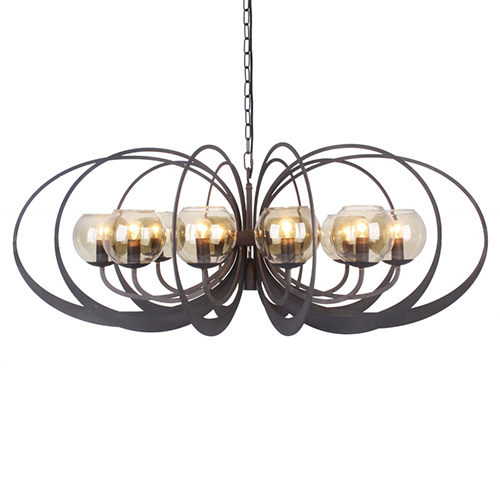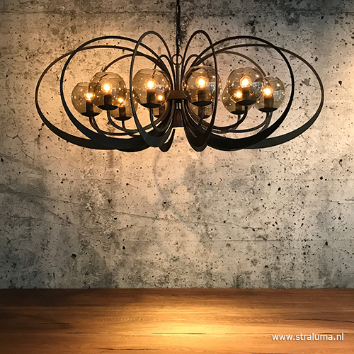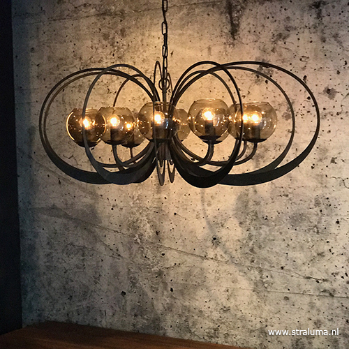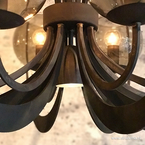 Deze zwart metalen hanglamp doet denken aan de klassieke kroonluchters. De mat zwarte hanglamp is gemaakt van metalen ringen die op symetrische wijze zijn geplaatst wat de kap een ovale vorm geeft. Bij iedere ring is een extra arm geplaatst waar de smoke glazen kappen met E14 fitting zijn verwerkt. Aan de onderzijde is de kap voorzien van een extra GU10 spot die een tafel onder de lamp goed uitlicht. Ideaal tijdens het eten of lezen. De metalen kap met glas hangt aan een stevige ketting die is in te korten en wordt met een ronde bevestiging aan het plafond opgehangen. Door de grootte van de kap past de lamp mooi boven een tafel langer dan 200 cm. De zwart lamp is goed te combineren in diverse woonstijlen als modern, landelijk of strak klassiek.