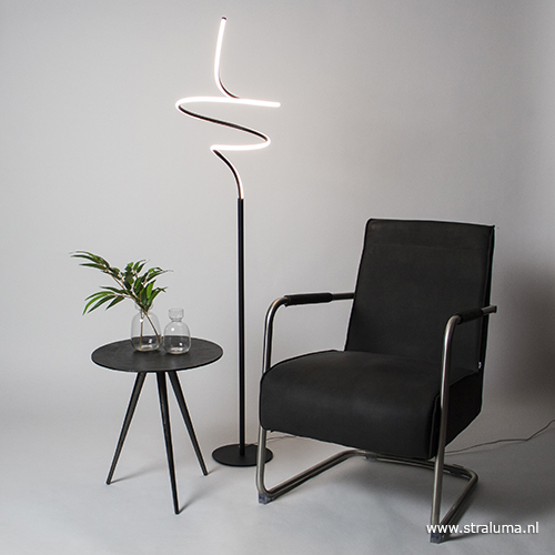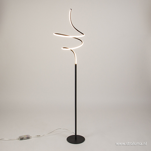 Deze moderne zwarte vloerlamp is een leuke speelse toevoeging aan het interieur. De LED lamp heeft de vorm van een krul waar de LED verlichting volledig in is verwerkt, dit geeft een mooie lichtverdeling en zorgt voor een goede sfeer. De sfeer kan extra worden bepaald door de snoerdimmer waarmee de lamp zachter kan worden gezet. Omdat er LED verlichting wordt gebruikt wordt de lamp niet warm en is deze ook nog eens energiezuinig.