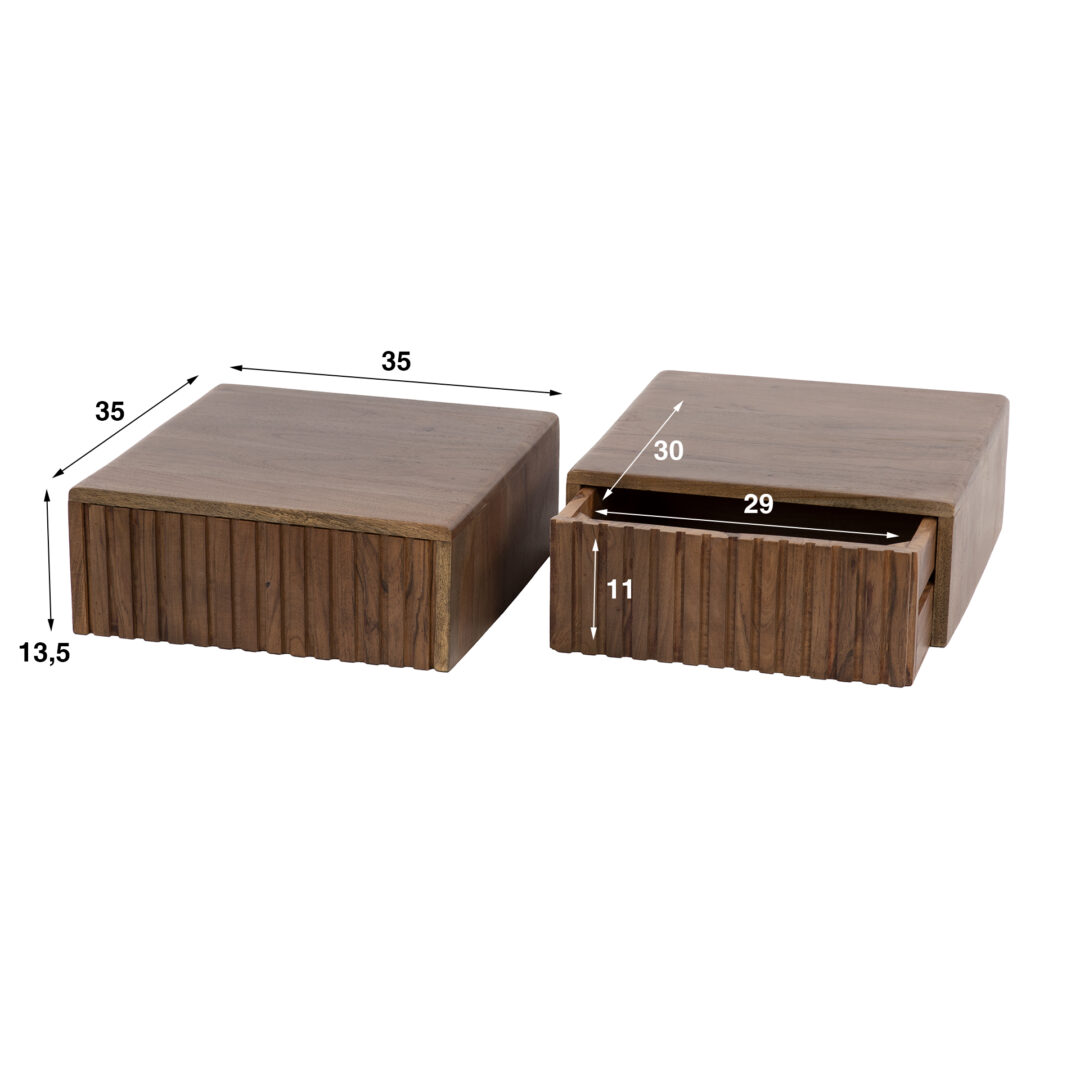 Specificaties hangend met lade • Producttype: Nachtkastje • Serie: Carve • Kleur: Bruin • Materiaal: Massief acaciahout • Afmetingen: 35 x 35 x 14 cm • Uitvoering: Zwevend • Opbergruimte: 1 lade